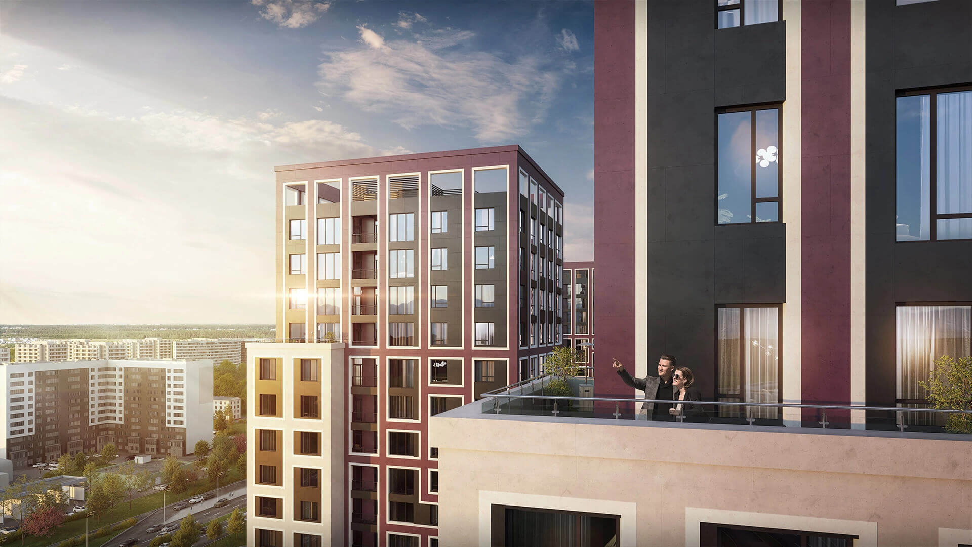 Пространство между корпусами организовано как благоустроенный арт-бульвар — с аллеями, зелёными насаждениями, арт-инсталляциями и зонами отдыха. Жителям доступны современные детские площадки, спортивные зоны, скамейки, прогулочные маршруты и тихие уголки для отдыха. Благоустройство территории продумано до мелочей, создавая атмосферу комфорта и уюта внутри квартала. Простор и продуманная организация пространства делают комплекс комфортным для жизни людей всех возрастов.