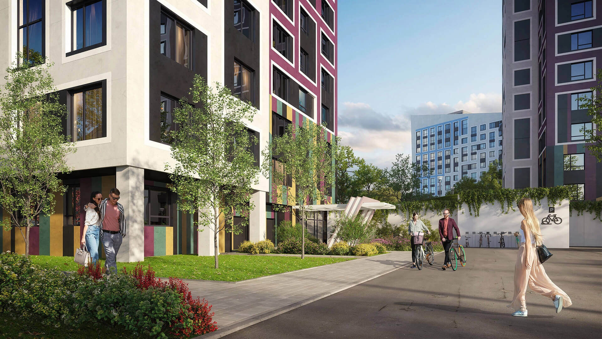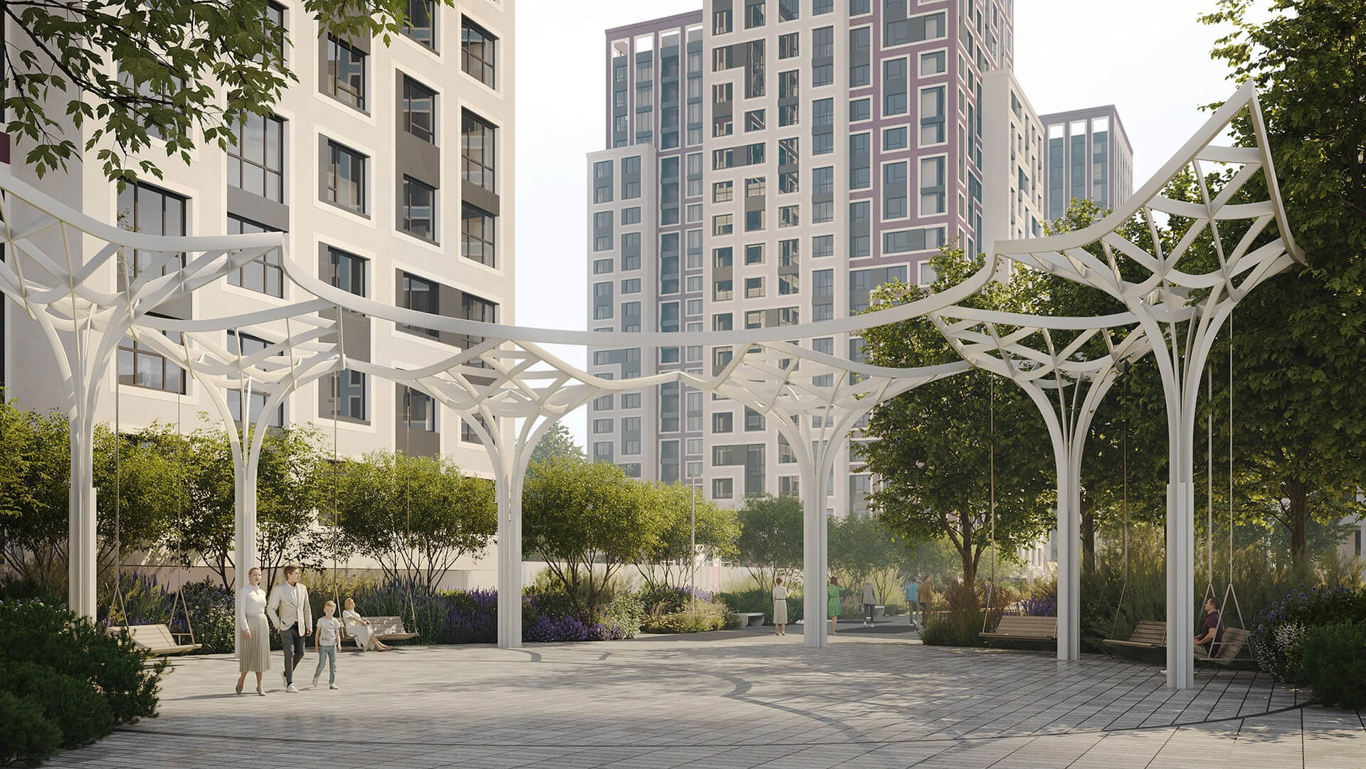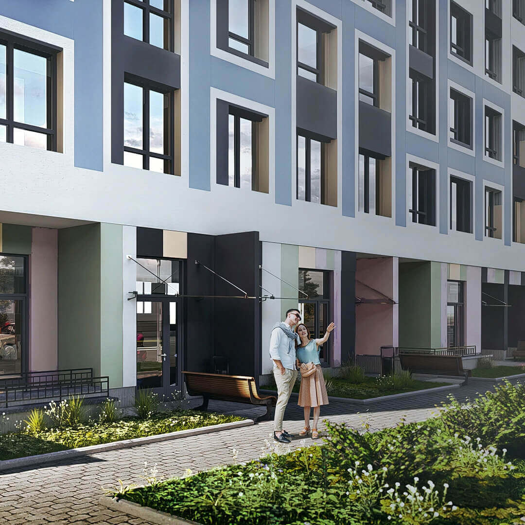 Пространство между корпусами организовано как благоустроенный арт-бульвар — с аллеями, зелёными насаждениями, арт-инсталляциями и зонами отдыха. Жителям доступны современные детские площадки, спортивные зоны, скамейки, прогулочные маршруты и тихие уголки для отдыха. Благоустройство территории продумано до мелочей, создавая атмосферу комфорта и уюта внутри квартала. Простор и продуманная организация пространства делают комплекс комфортным для жизни людей всех возрастов.