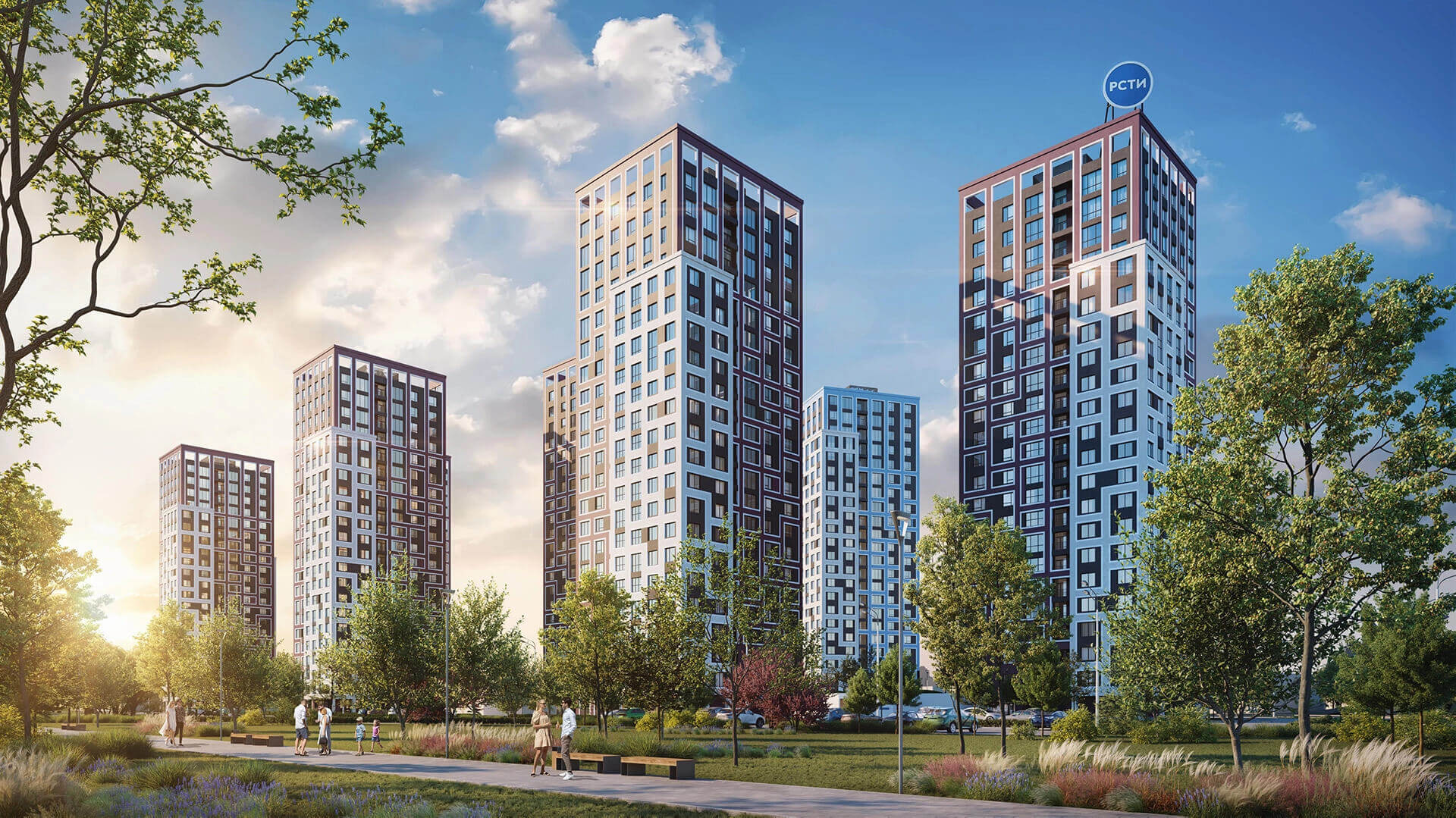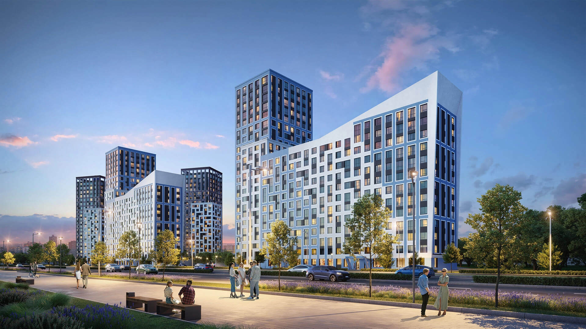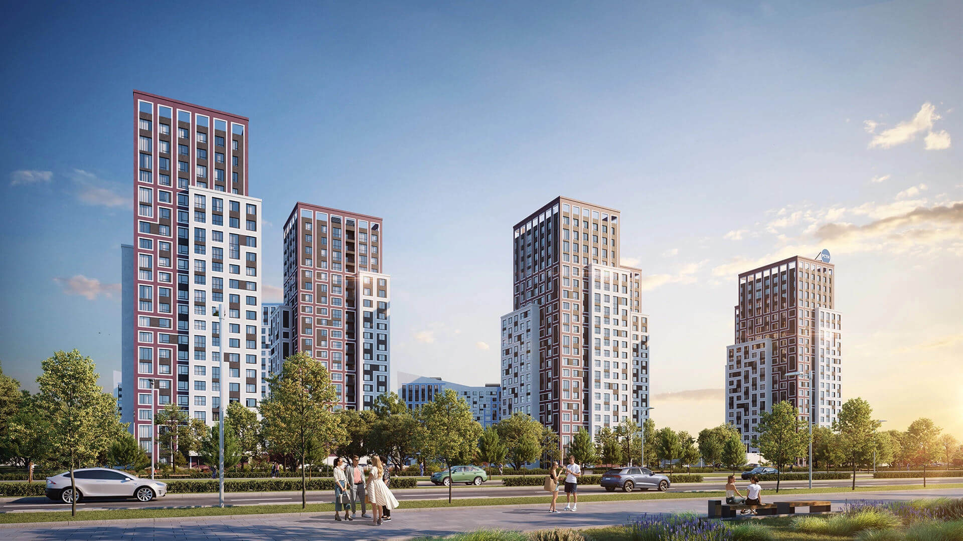 Пространство между корпусами организовано как благоустроенный арт-бульвар — с аллеями, зелёными насаждениями, арт-инсталляциями и зонами отдыха. Жителям доступны современные детские площадки, спортивные зоны, скамейки, прогулочные маршруты и тихие уголки для отдыха. Благоустройство территории продумано до мелочей, создавая атмосферу комфорта и уюта внутри квартала. Простор и продуманная организация пространства делают комплекс комфортным для жизни людей всех возрастов.