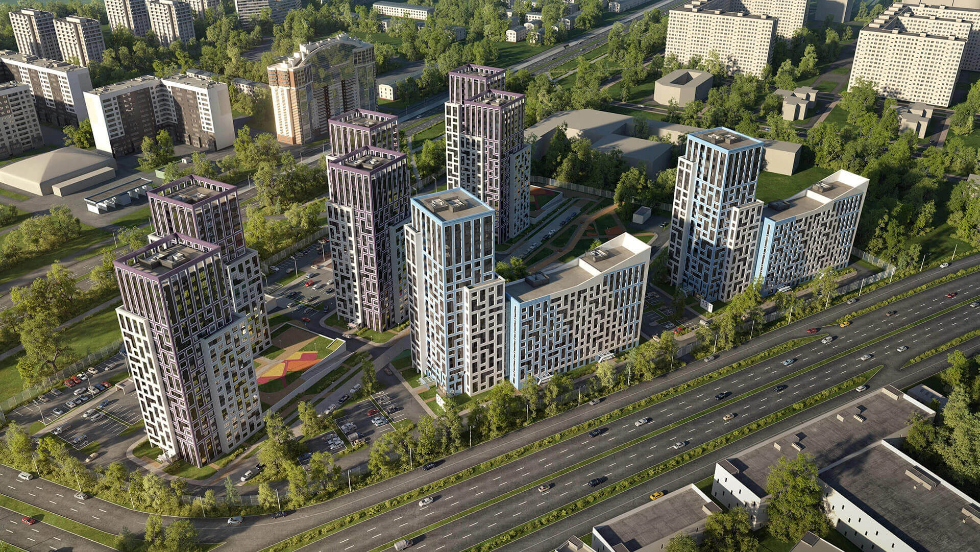 Во дворах обустроены современные игровые площадки для разных возрастов, спортивные зоны с тренажёрами, тихие зоны отдыха и газоны для пикников. Все площадки выполнены из безопасных материалов и соответствуют современным стандартам. Разнообразные сценарии использования общественного пространства создают ощущение уюта и приватности, при этом поддерживая активный ритм жизни. Освещение территории обеспечивает комфорт в тёмное время суток и подчёркивает архитектурные детали комплекса.